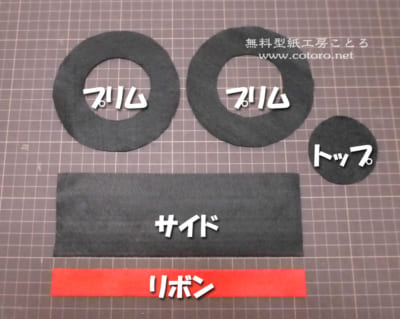 【1】フェルトを切ります。プリムは上と下で合計2枚使います。リボンは省略OKです。ロータリーカッターを使うときれいに円が切り抜けます。(ハサミの場合は半分に折って半円を切ってみてください)