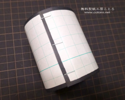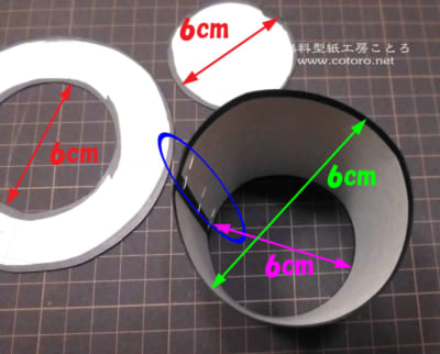 【4】サイド(厚紙)の端を約1cmぐらいかさねて、直径が6cmになるように微調整します。トップ(厚紙)も直径6cmなので、トップに重ねて調節してみてください。