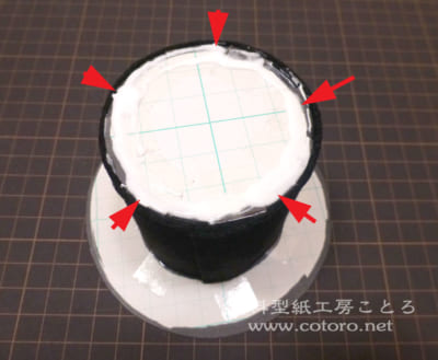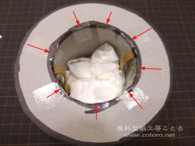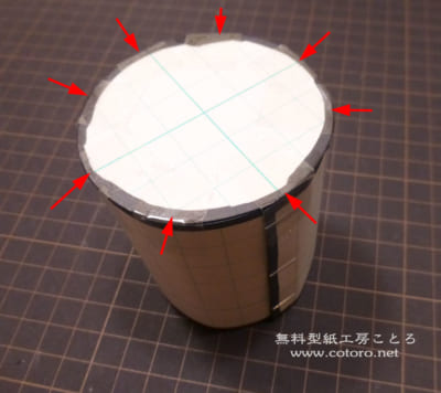 【6】さきほど丸めたサイド(厚紙)の円をふさぐようにトップ(厚紙)を置いて、セロテープで8か所ぐらいとめます。