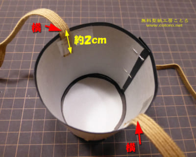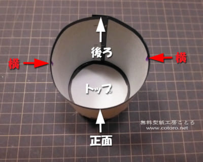 【7】反対側からみると、このようになっています。サイド(厚紙)の継ぎ目が後ろ(背面)になり、その反対側が正面(顔側)になります。後ろと正面の中間の赤矢印に印を付けてください。ここにゴムひもを付けることになります。