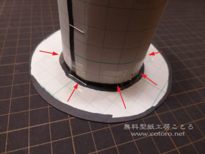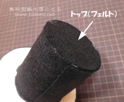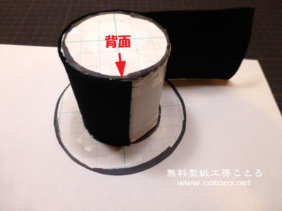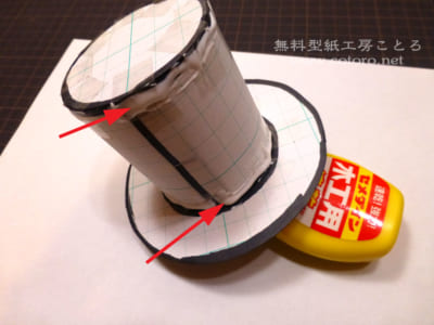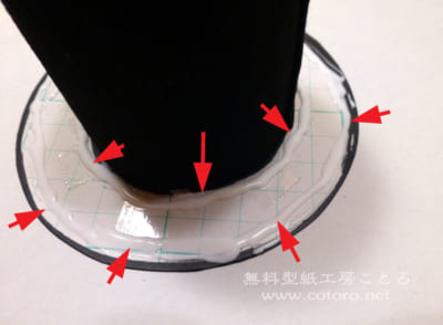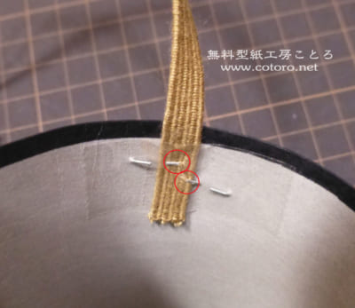 【13】プリム(厚紙)をサイド(厚紙)に乗せて、8か所ほどセロテープで固定します。