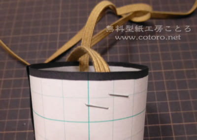 【9】サイド(厚紙)の内側で、先ほど付けた印の位置にゴムひもを2cmぐらいセロテープで仮止めします。仮止めですが、このセロテープはあとではずしません。