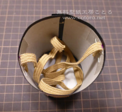 【12】ゴムひもが今後の作業に邪魔になるので、厚紙の内側に入れておいてください。ゴムひもが外に飛び出しやすいときは、ティッシュペーパーを2枚ほど入れておくとストッパーになります。