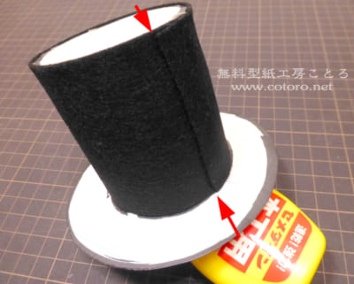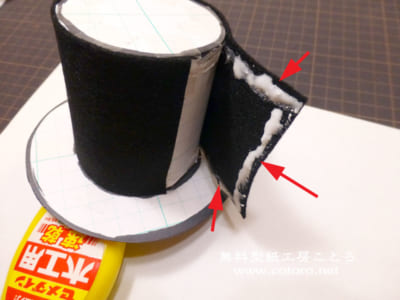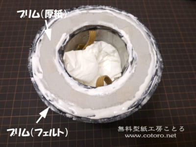【23】プリム(厚紙)の裏にボンドを付けます。このとき、先ほどつけたプリム(フェルト)のふちが数mm飛び出していますので、そちらにもボンドを付けてください。