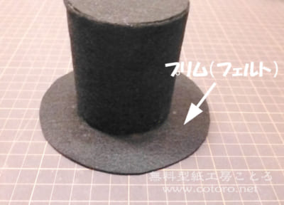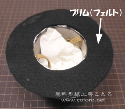 【27】ボンドが乾いたら、プリムのふちなどで飛び出しているフェルトをカットします。一周ぐるりと1~2mmカットしてもOKです。その場合、切りすぎて厚紙が見えないように注意してください。