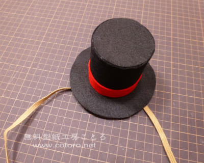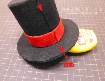 【26】【リボンを付ける場合に行う】サイド(フェルト)の下の方に、リボンを巻き付けます。このとき、背面に継ぎ目が来るようにしてください。
