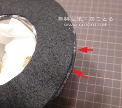 【18】ボンドがはみ出ないように、サイド(フェルト)の端も巻き付けます。もし、ボンドがフェルトについた場合はウェットティッシュなどで軽くつまむようにふき取ってください。