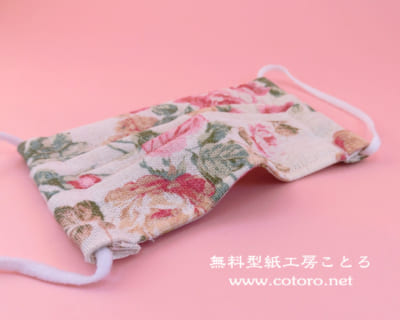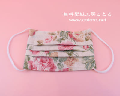 使い捨てマスクとして一般的なプリーツタイプのマスクと同じような形です。作成例は、大人(小さめ)サイズです。その他のサイズも作り方は同じです。
