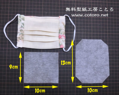 大人(小さめ)サイズには、プリーツを開かない場合は横10cm×縦9cmぐらいのフィルターがちょうどいいですが、プリーツを開く場合は、縦を13cmにして四隅のカドを2cmぐらい切り落とすとちょうどよさそうです。