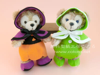 型紙を拡大・縮小して調節すると、いろいろな縫いぐるみや人形に着せられます(型紙の拡大縮小についてはこちらをご覧ください)。