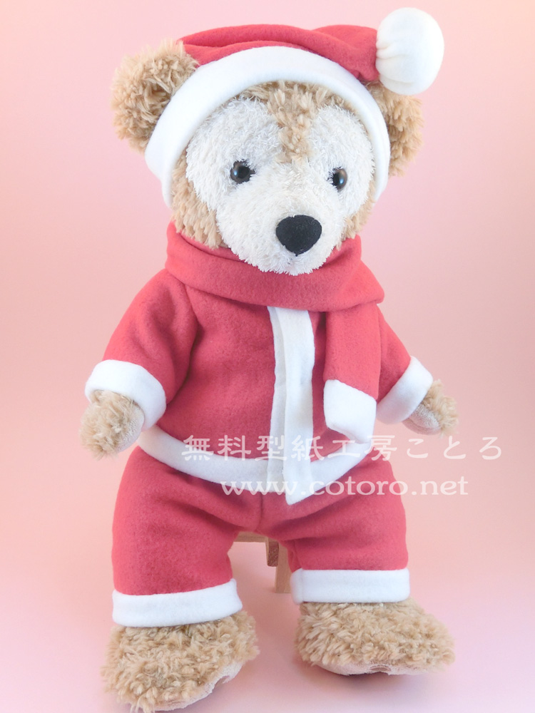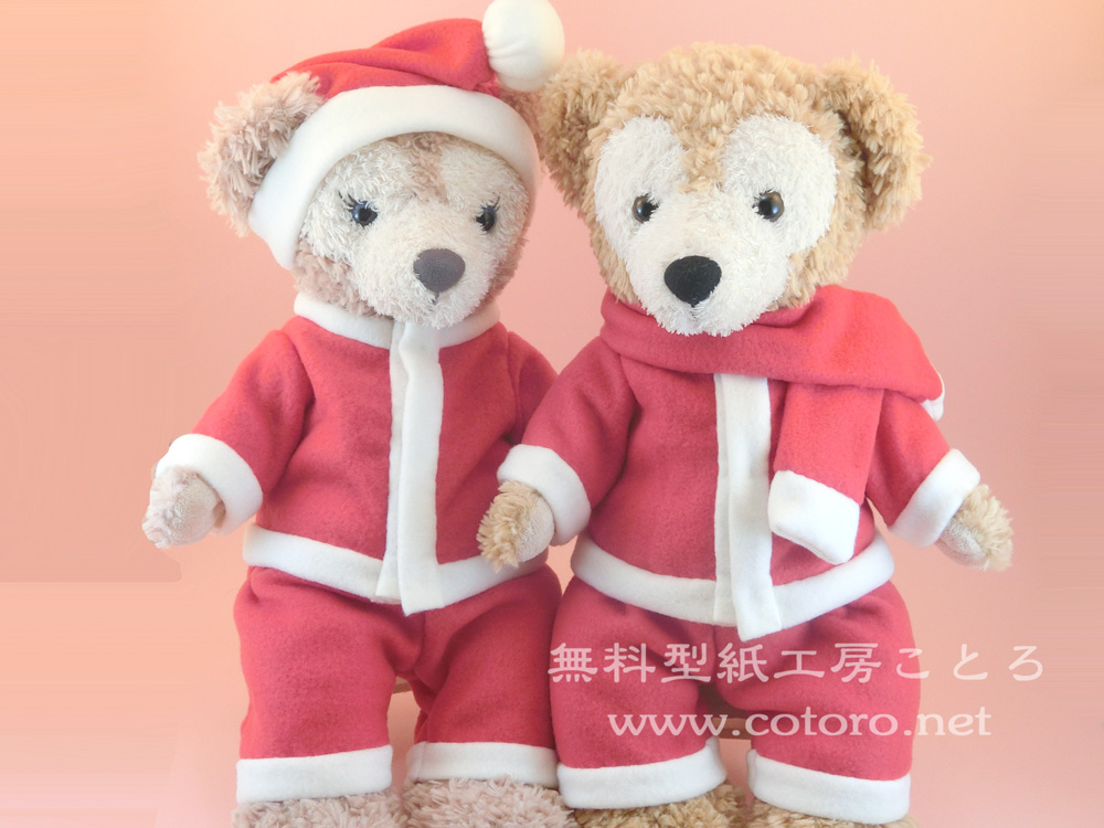 型紙を拡大・縮小して調節すると、いろいろな縫いぐるみや人形に着せられます(型紙の拡大縮小についてはこちらをご覧ください)。