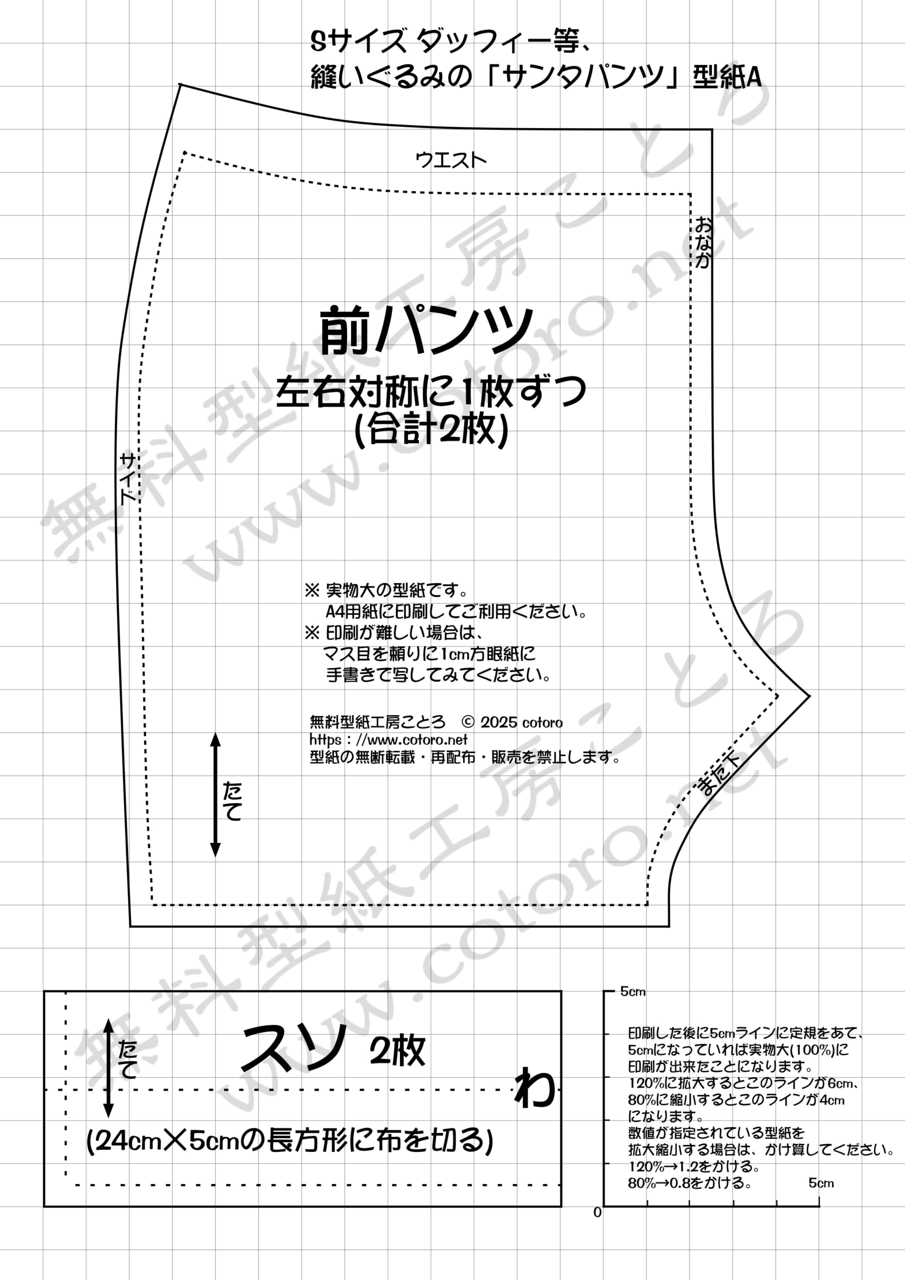 実物大の型紙です。「余白なし(余白ゼロ)」の設定で、A4用紙に印刷して使ってください。うまく実物大に印刷できない場合はこちらをご覧ください。また、印刷する環境がない場合は1cm方眼紙を用意し、型紙画像のマス目(1cm幅)を頼りに手書きで写してみてください。