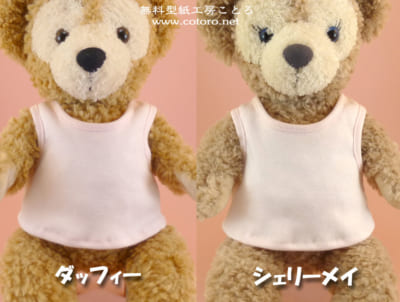 Sサイズダッフィーにちょうどいいサイズに作ってあります。シェリーメイは少し細身なので、同じタンクトップを着せるとゆとりがある感じになります。このままでもよさそうですが、気になる場合は、ほんの少し型紙を縮小してみてください。