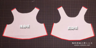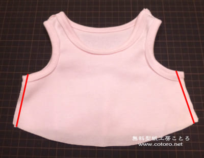 【1】布を切ります。そして、ほつれ止めをする場合は赤線の部分にします(ほつれ止め液がおすすめです)。私が今回使ったスムースニット生地はほつれにくいため、ほつれ止めは行いませんでした。また、首テープと腕テープは見頃の肩と合わせる部分にしるしをつけておいてください(青矢印)。