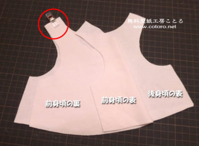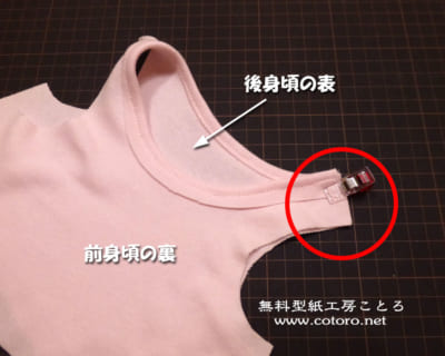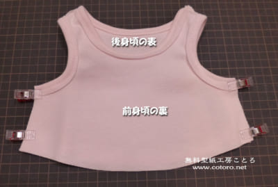 【2】前身頃と後身頃を中表に合わせて(表地同士を合わせて)、片側の肩の部分をクリップなどで止めます。