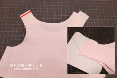【23】前身頃と後身頃を中表に合わせ、わきの下部分をきれいに合わせてクリップなどでとめます。