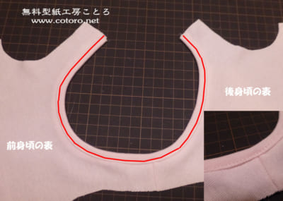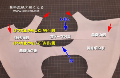 【5】写真のように身頃の表と、首テープの裏が見えるように置きます。そして、見頃とテープの端(赤矢印)、肩の位置(青矢印)を確認します。