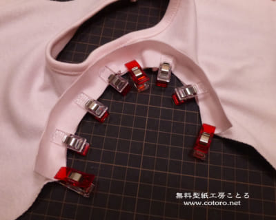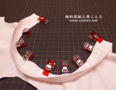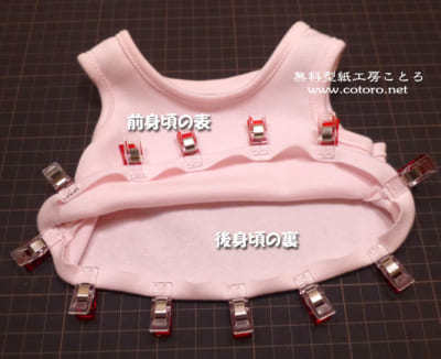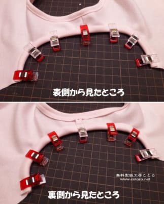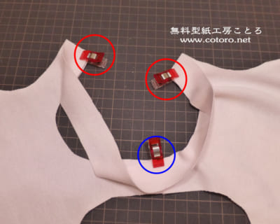 【13】縫われていない肩の同士を中表にあわせてクリップでとめます。