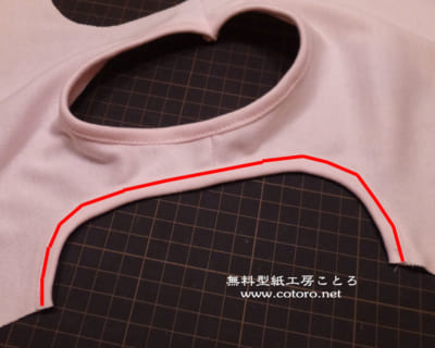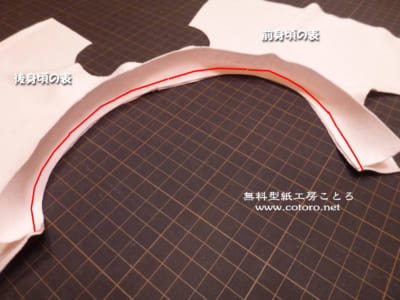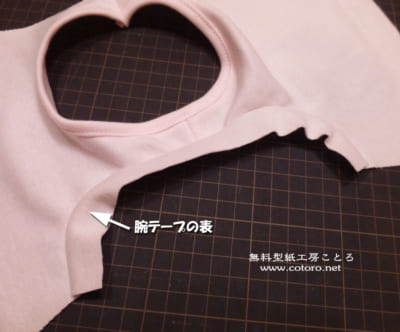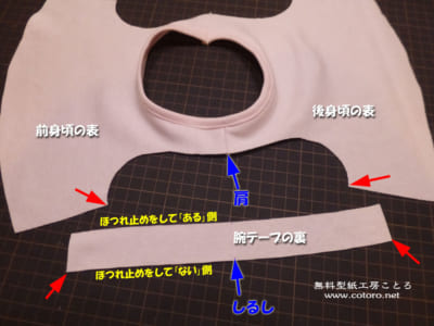 【15】写真のように身頃の表と、腕テープの裏が見えるように置きます。そして、見頃とテープの端(赤矢印)、肩の位置(青矢印)を確認します。これは、首テープのときとほとんど同じ作業です。