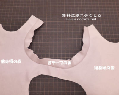 このようになってしまった場合は、手縫い(まつり縫いなど)で、表に縫い目がなるべく出ないように首テープを見頃に縫い付けてください。