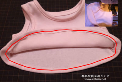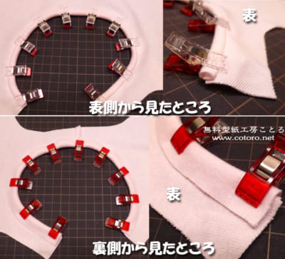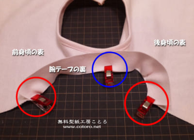 【10】首テープをさらに身頃の切り口に巻き付けるようにして(見頃を折らないように気を付けて)身頃の裏に倒し、クリップなどでとめます。このとき、裏側から見たときに首テープの幅が1cm以上見えるようにしてください。