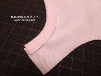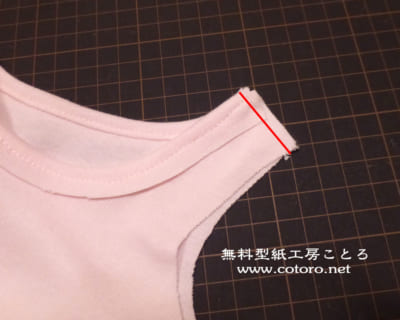 【21】身頃の表側から、首テープの上を縫います(ステッチをかけます)。このとき縫う位置は、腕テープの端から2~3mmぐらいの位置です。