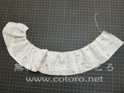 【5】先ほどのミシン設定で縫うと、自然とある程度のギャザーが寄ります。先ほど縫ったミシンの上糸を引っ張ったり緩めたりすると、ギャザーの量を調節できます。