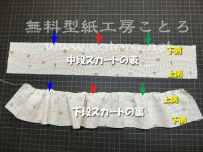 【6】工程【2】で付けたしるしを上にして中段スカートと下段スカートを置きます。