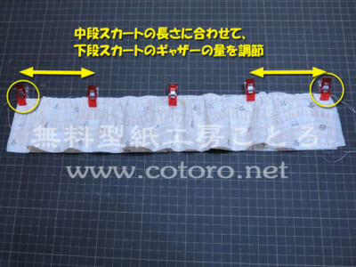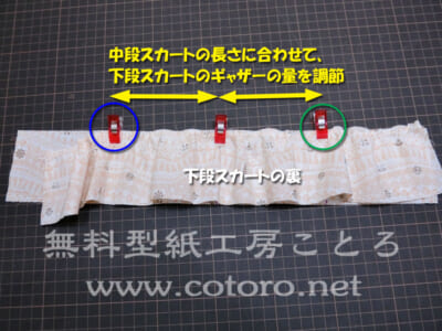 【8】中段スカートの長さに合わせて、中心から隣のしるしまで、下段スカートのギャザーの量を調節します。そして、中段スカートのしるしと、下段スカートのしるし同士を合わせてクリップなどでとめます。