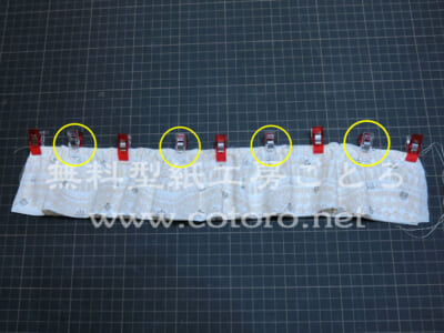 【10】ギャザーが均等になるように調節しながら、クリップの間もさらにとめます。