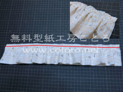【3】まず、ギャザーを寄せる箇所(ミシンで縫うライン)を確認します。下段スカートの上側の端から5mmぐらいの位置(縫い代5mm)の赤線部分です。