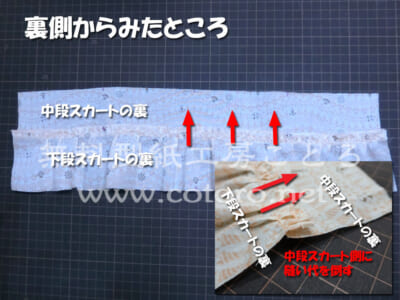 【14】こちらは、裏側から見たところです。縫い代(先ほど縫った部分から布の端までの1cm幅の部分)を中段スカート側に倒します。