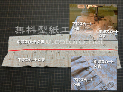 【15】先ほど中段スカート側に倒した縫い代の上を赤線のように縫います。赤線は下段スカートのギャザーから2~3mmぐらいの位置です。